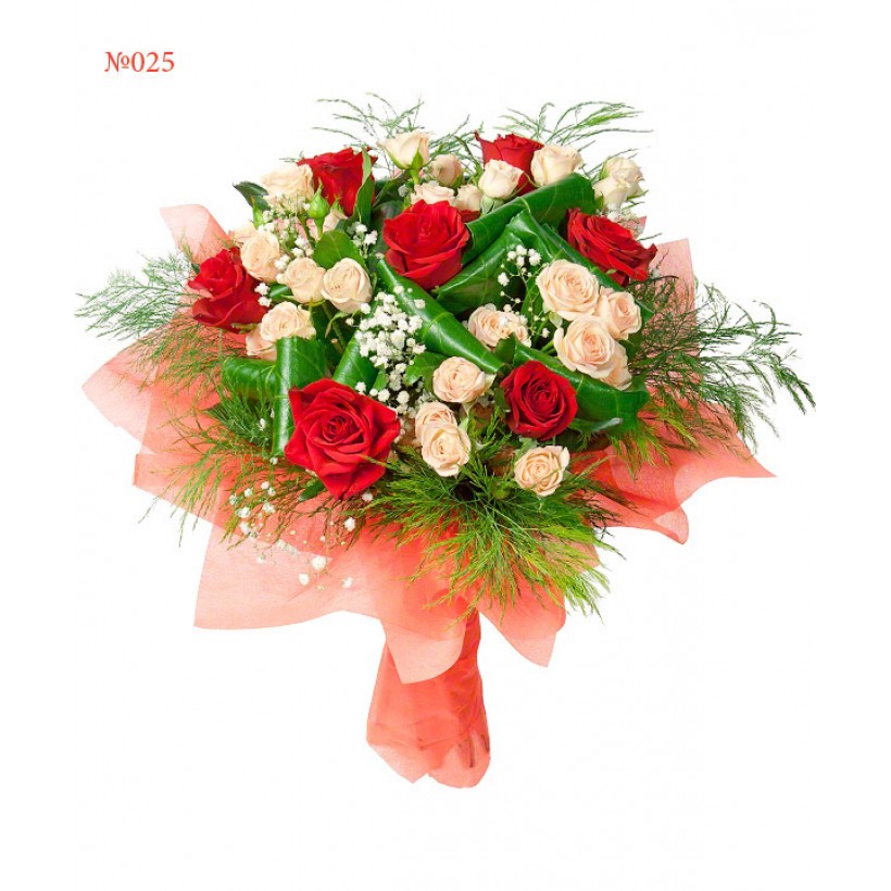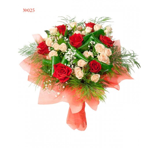 What do women want? Every woman wants to be surrounded with beauty and luxury. Our florists did their best to please your lady. The composition of rich bright-red and dim rose roses, decorated with greenery and gypsophyle, has emanates sunrise power. The crimson “lace” completes the picture.