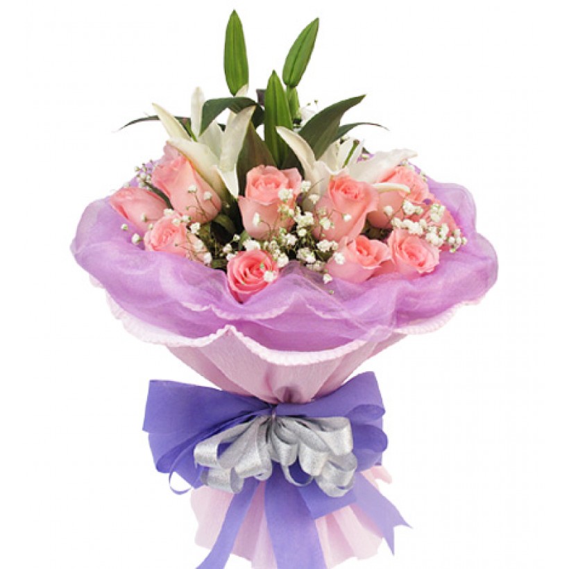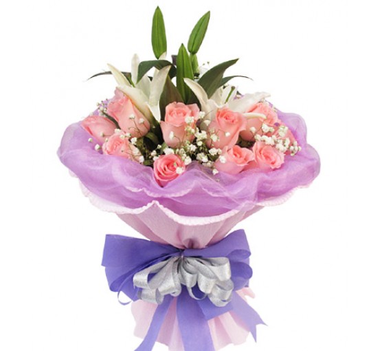 11 pink roses, one long white perfume lily, with the amount of stars with the amount. Pink paper curling double packaging (inner layer of paperwith a purple pearl bead yarn wavy circle around the bouquet),underpinning white tissue paper, blue + silver-color ribbon bow