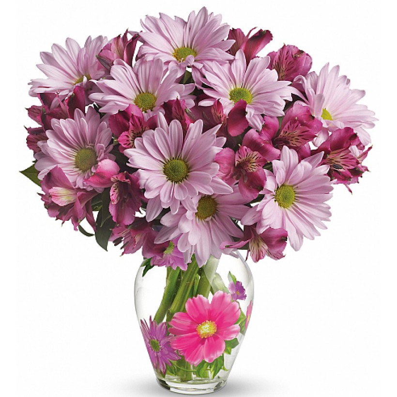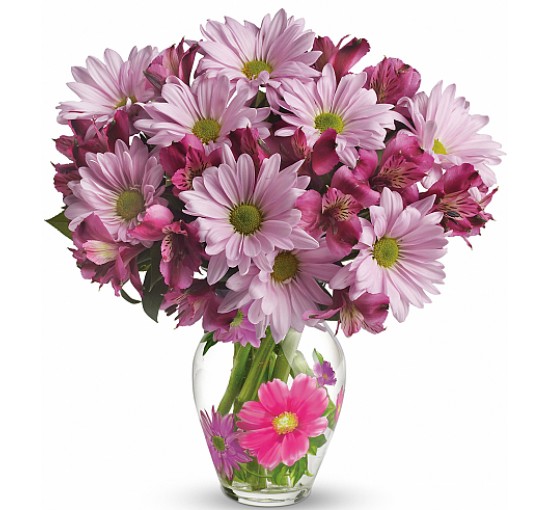 Pretty 9 stems of Lavander Pink Daisy accented with Lemon leaf in a clear glass vase decorated with spring flowers.
