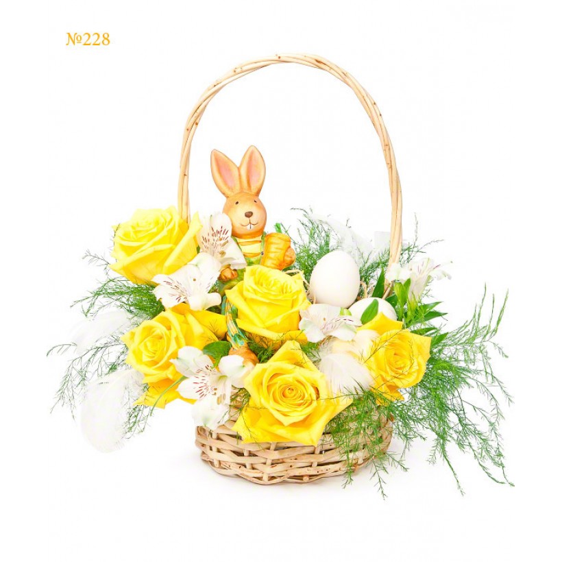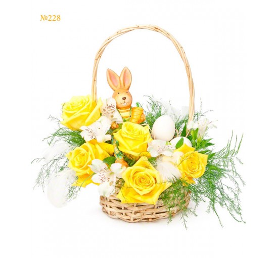 Yellow roses are known in the Christian tradition as the flowers of Madonna’s glory. The joyful bunny symbolizes prosperity and success, while the egg stands for new life. The basket adds the holiday-like appearance to the whole composition, making it a nice Easter present.
