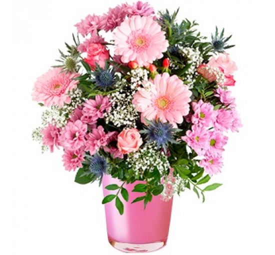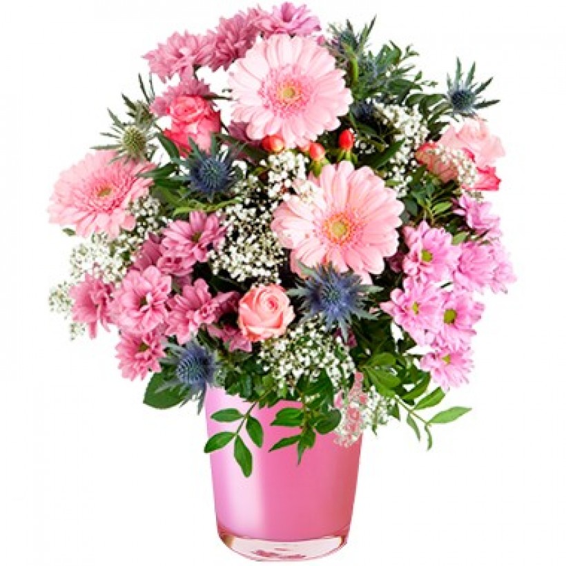 This bouquet of Premium pink roses also features chrysanthemums, germini, eryngium, gypsophilia, hypericum, and fresh greenery. *VASE IS NOT INCLUDED*