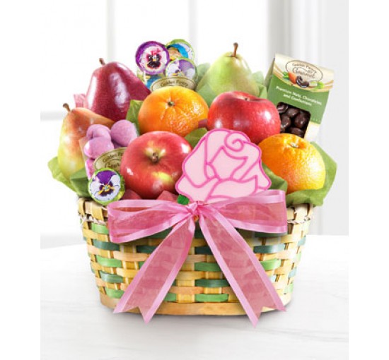 The Spring Sensation Fruit & Sweets Gourmet Gift Basket is an incredible array of gourmet goodies ready to make your special recipient's day one they won't soon forget! A beautiful natural woven basket with pink and green accents and tied with a pink ribbon. Creating a beautiful presentation upon arrival, this spring gift basket makes a wonderful Mother's Day or just because.