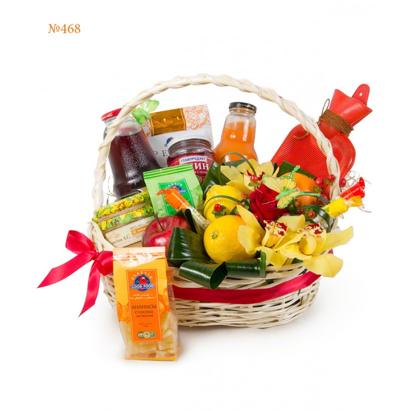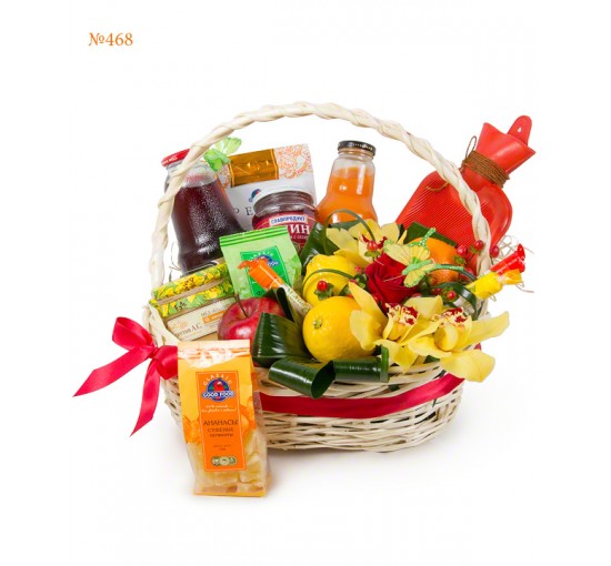 A gift basket for a young lady, not indifferent for you, will support her during an illness. The set contains all the necessary to invigorate and replenish with vitamins a weakened body. A grateful smile will be evoked by a hot-water bag, which will warm the sick lady both literally and figuratevely. The composition is supplemented with orchids and a big red rose, which are recognized queens of the flower world.