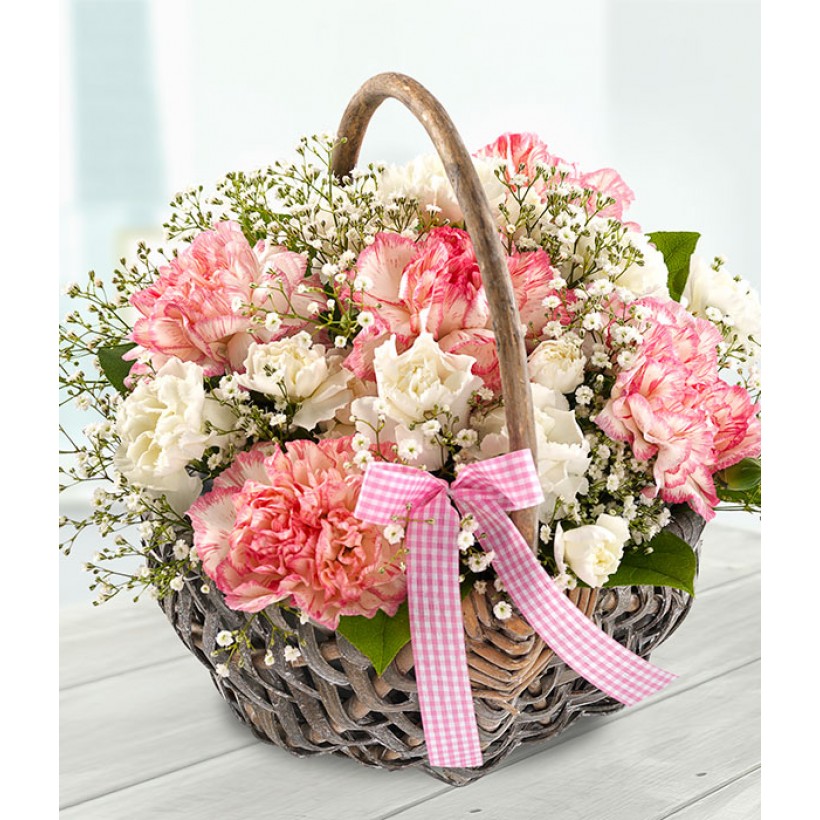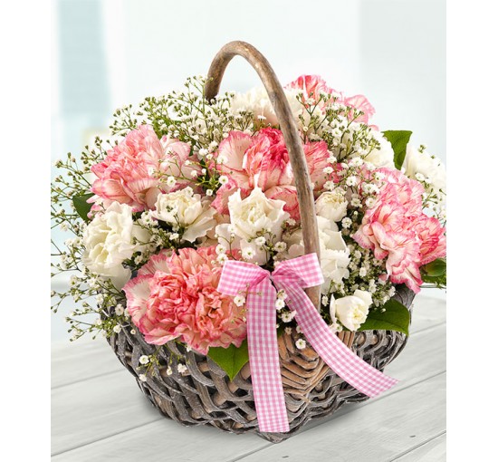 A very pretty Mother's Day flower basket arrangement featuring pink and white Carnations, Simply stunning!!